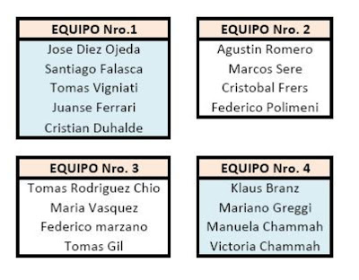 Los equipos quedaron conformados de la siguiente manera, espero por favor que vengan todos ya que la falta de uno de los integrantes hará que todo el equipo no pueda participar, sean responsables y lleguen a horario el sábado próximo a las 9:30 Hs.